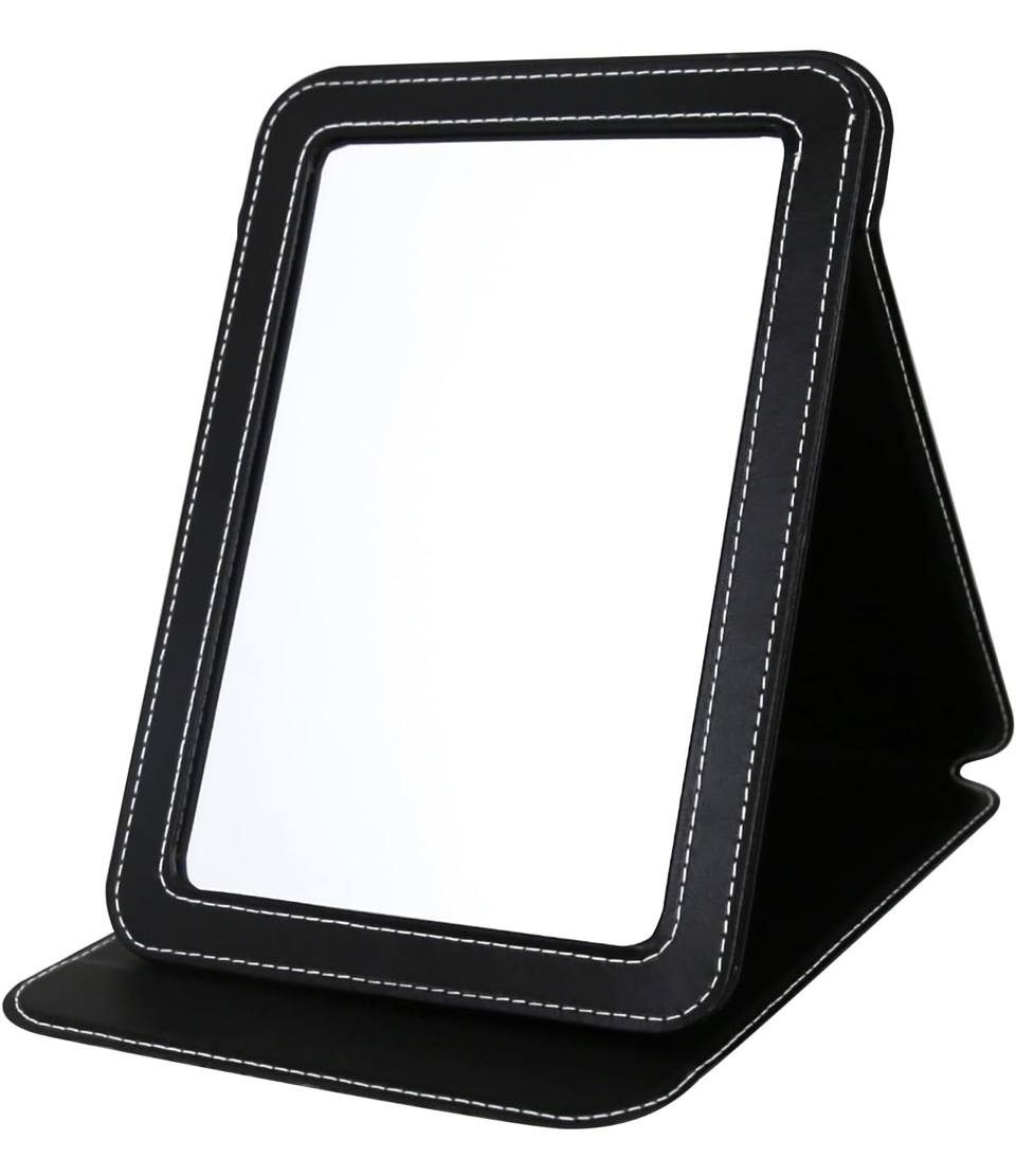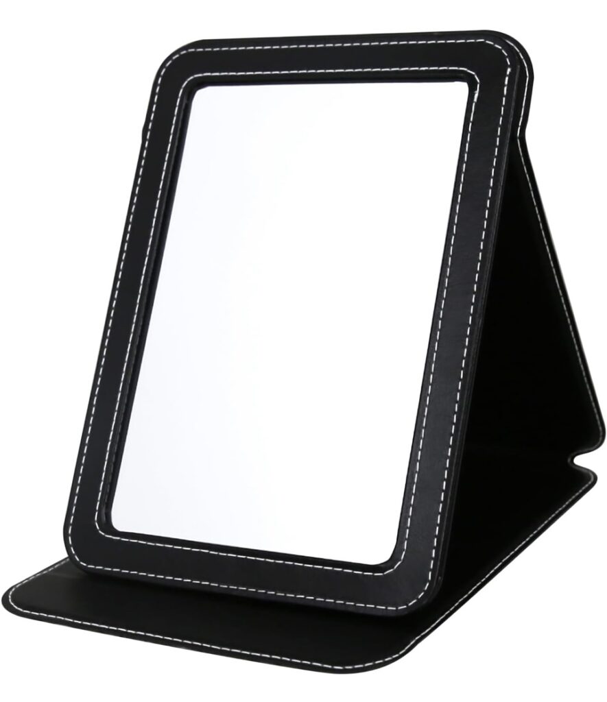 I just used the travel mirror shown below on a recent trip, and it was perfect to set up on the desk in the hotel room to do my make-up. The size is 6.5″ x 8.9″. The mirror folds flat and is lightweight so it doesn’t take up much room in your suitcase.