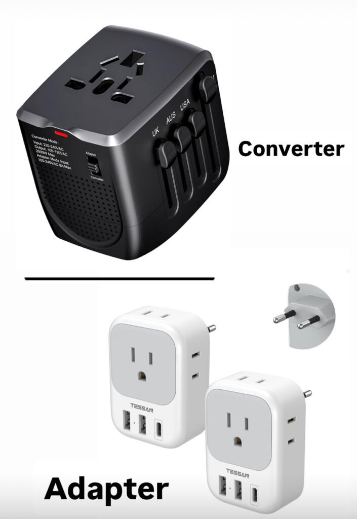 If you’re packing your favorite hairdryer, curling iron, or hot rollers, you’ll need a converter to convert the voltage. The converter shown below has plugs for the USA, UK, Europe, and Australia. You can use an adapter plug (in the photo below) to charge your phone. If you don’t already have one, you may want to consider a portable phone charger so your battery doesn’t run out when you’re out and about taking photos and videos.
